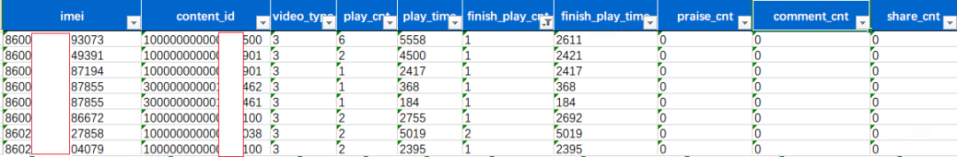 行为表包含用户的imei,物品的content-id,但是没有直接的用户评分,实践中我们的解决方案是利用用户的其他行为进行加权得出用户对物品的评分。即