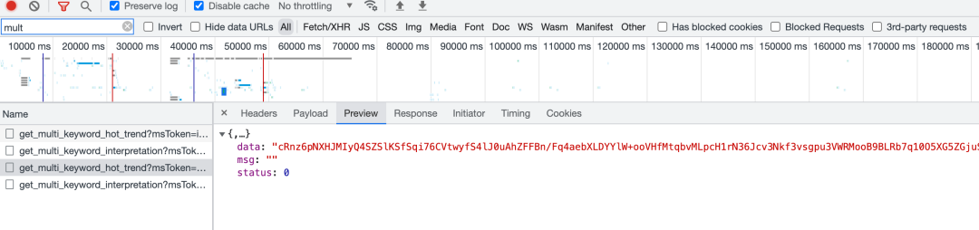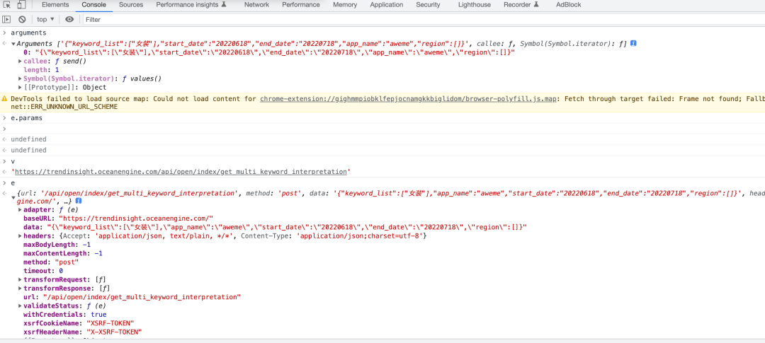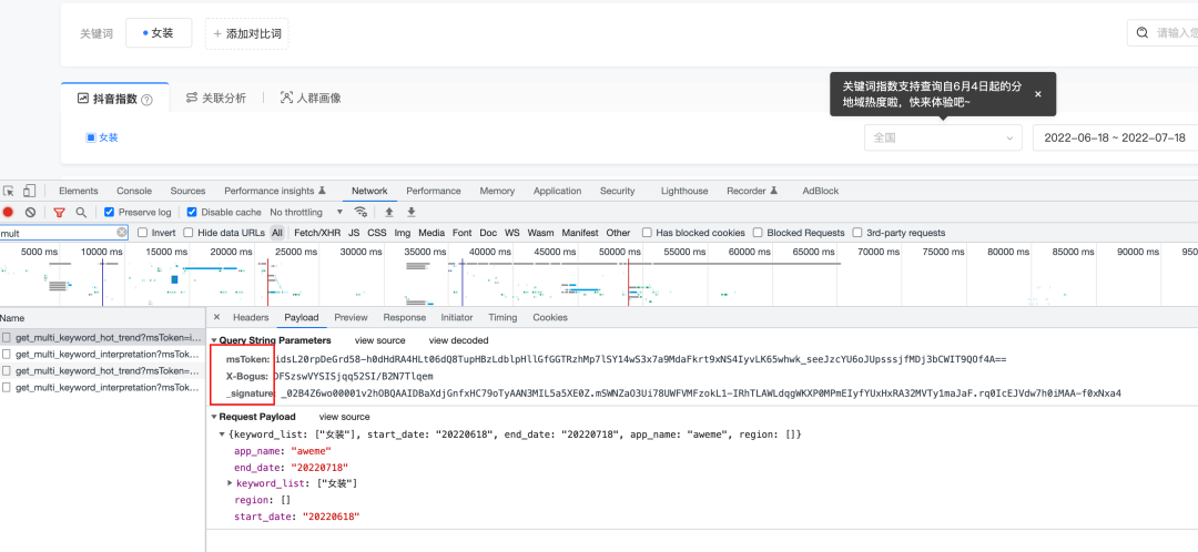提前已经通过抓包,获取到目标url是https://trendinsight.oceanengine.com/api/open/index/get_multi_keyword_hot_trend
