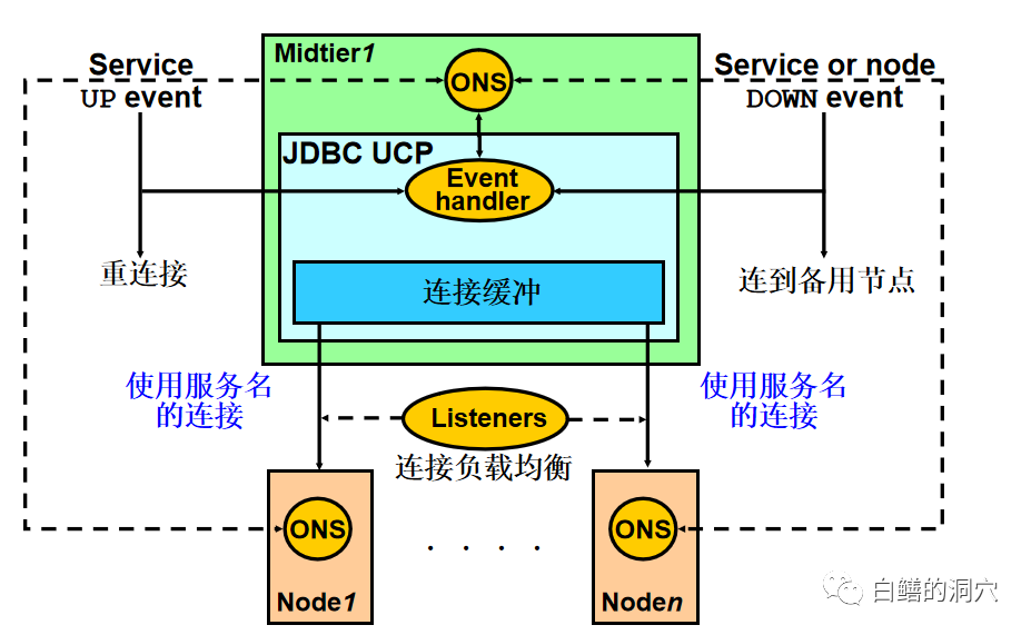和TAF不同,FCF是通过FAN的模式进行故障切换的。TAF是由客户端发起的,因此客户端需要知道实例故障,然后根据TNS的定义去找到还活着的实例,然后再去重连。考虑到网络延时等因素,这个过程需要几十秒钟到几分钟的时间才能完成。而FCF通过Oracle的ONS服务(Oracle Notify Services)来实现。