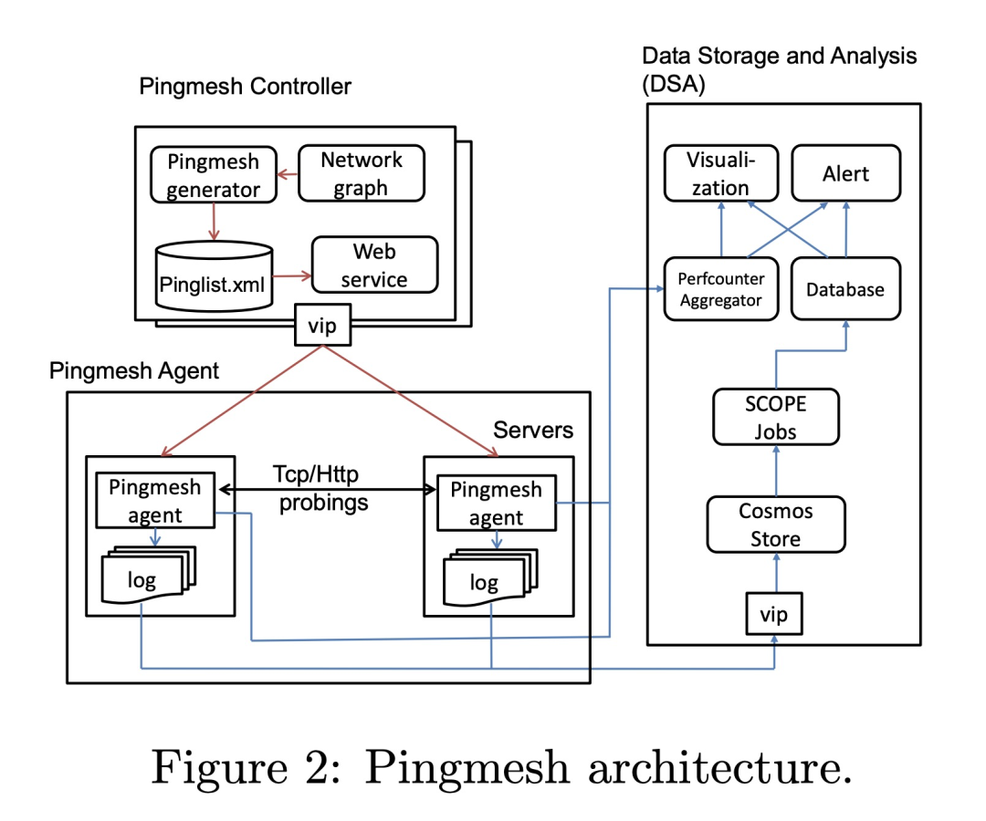 命令收集结果,每台服务器去 ping (N-1) 台,也就是 N^2 的复杂度,稳定性和性能都存在一些问题,最近打算对这部分进行重写,在重新调研期间看到了 Pingmesh 这篇论文,Pingmesh 是微软用来监控数据中心网络情况而开发的软件,通过阅读这篇论文来学习下他们是怎么做的。