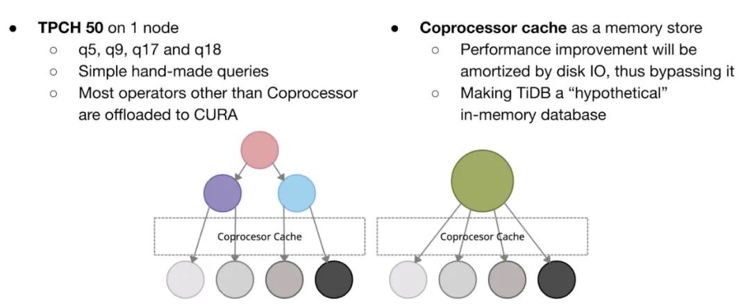这个项目直接在 GPU 这个硬件领域,给 TiDB 带来了新的扩展性,其实原理还是很简单的,就是将之前很多算子计算从 CPU 放到了 GPU。实际展示的时候,为了保证没有 IO 的干扰,馒头他们这次将聚合数据先放到了 Coprocessor cache 层,然后在这个 cache 层上面对上层算子进行了 GPU 加速,类似下图展示: