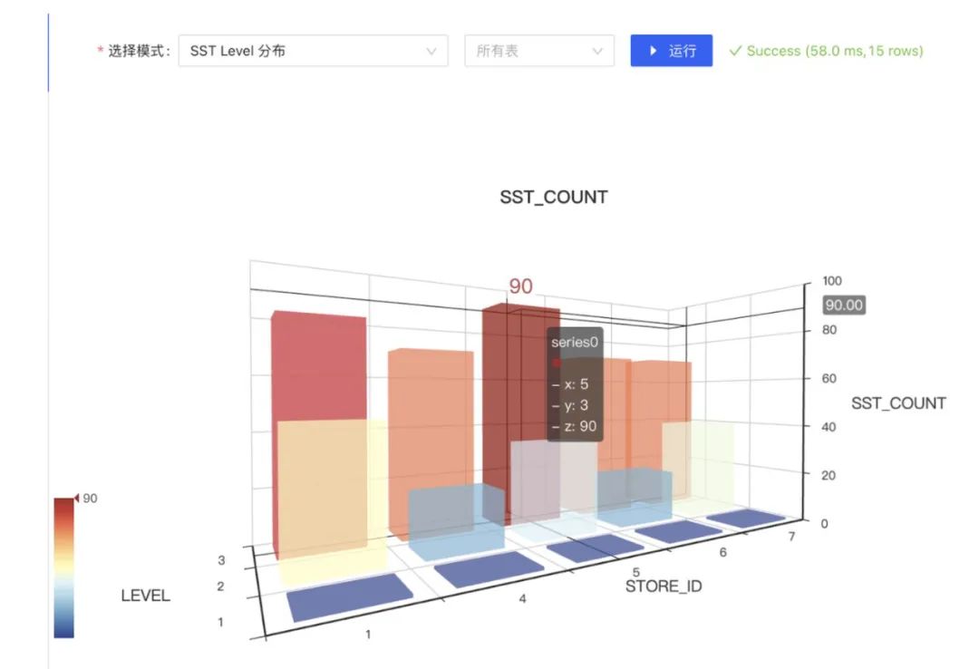 在这个章节,我最后要介绍的是 hundundm 团队的 TiDB 视界功能,他们借鉴了 BI 的思路,将 TiDB 集群的很多信息,在 dashboard 里面可视化的展现了出来,譬如下图的表 SST 数据分布: