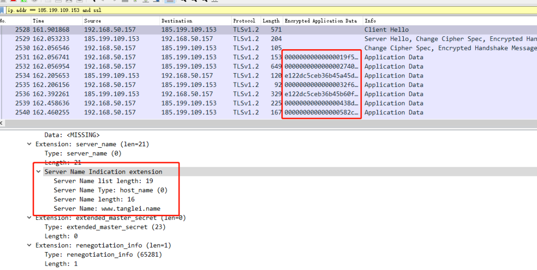 如下图所示,上面的截图其实是访问我的个人博客(www.tanglei.name)的抓包情况,客户端发送握手请求时,很自觉带上了自己的域名。