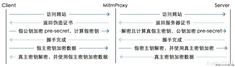 如下图所示,这个『MitmProxy』充当了中间人,互相欺骗: