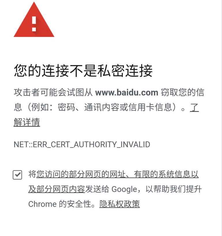 提示,连接不是私密连接,其实就是浏览器识别了证书不太对劲,没有信任。而如果此时手机安装了 Fiddler 的证书,就会正常访问。
