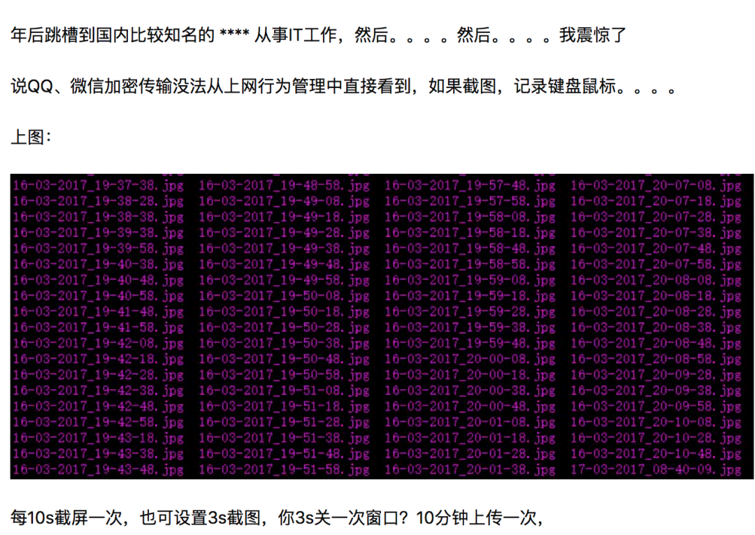 更何况,一般办公电脑都会预安装一些公司安全软件,至于这些软件究竟都干了些什么,有没有进行传说中悄悄截图什么的,这就因人(公司)而异了。(不讨论类似行为是否涉及到侵犯了员工隐私等问题)
