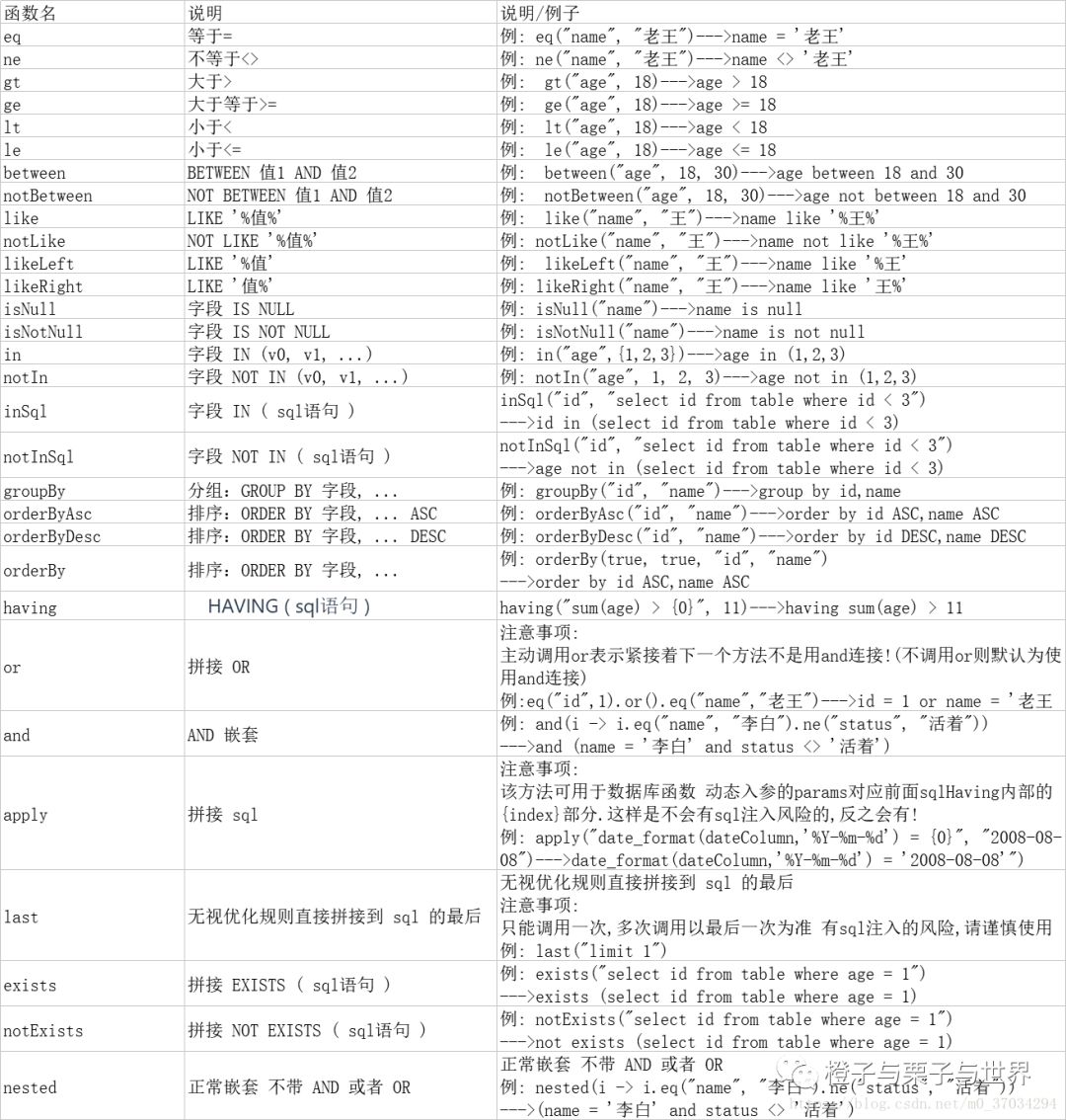 public List<FndUser> lambdaSimpleQuery(FndUser fndUser) { LambdaQueryWrapper<FndUser> fndUserLambdaQueryWrapper = new LambdaQueryWrapper<>(); fndUserLambdaQueryWrapper // 等于= 例: eq("name", "老王")--->name = '老王' .eq(FndUser::getJobNumber, fndUser.getJobNumber()) // 大于等于 >= 例: ge("age", 18)--->age >= 18 .ge(FndUser::getAge, fndUser.getAge()) // LIKE '%值%' 例: like("name", "王")--->name like '%王%' .like(FndUser::getLoginName, fndUser.getLoginName()) // 排序:ORDER BY 字段, ... DESC 例: orderByDesc("id", "name")--->order by id DESC,name DESC .orderByDesc(FndUser::getSCt, FndUser::getJobNumber); // Service的查询接口(和Mapper的selectList接口是差不多的意思,) return super.list(fndUserLambdaQueryWrapper); }