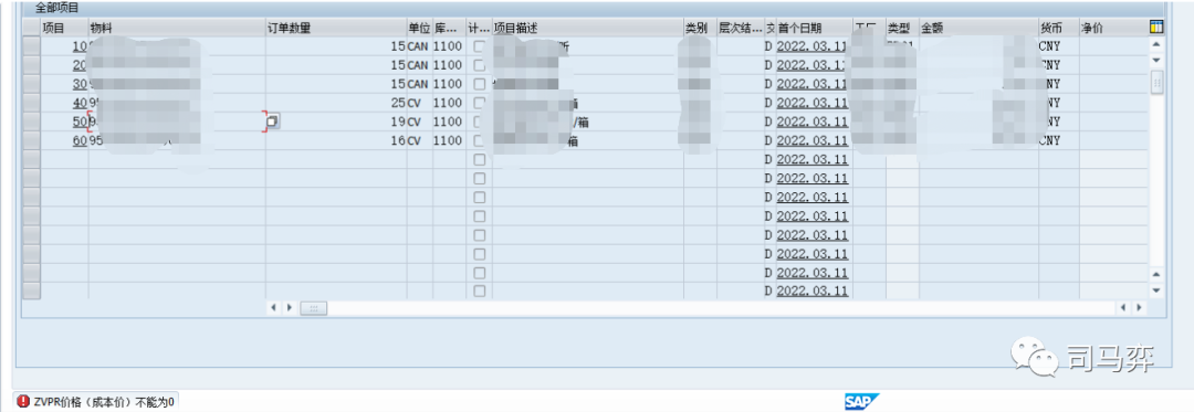 但是成本价是0,这个时候只有一种可能,就是还没有生成相关的采购订单数据。