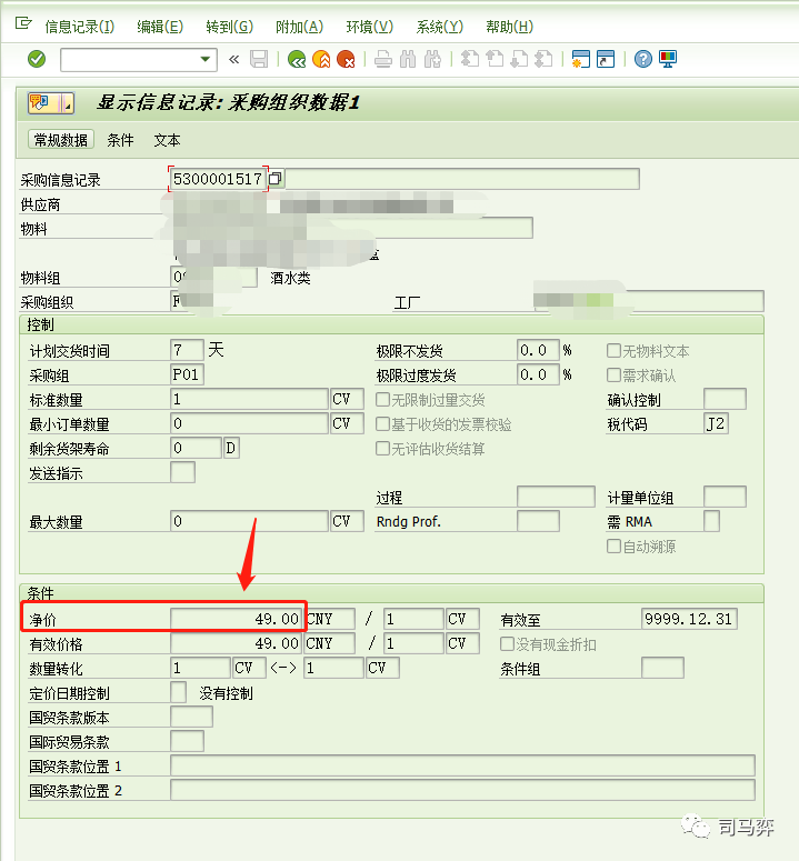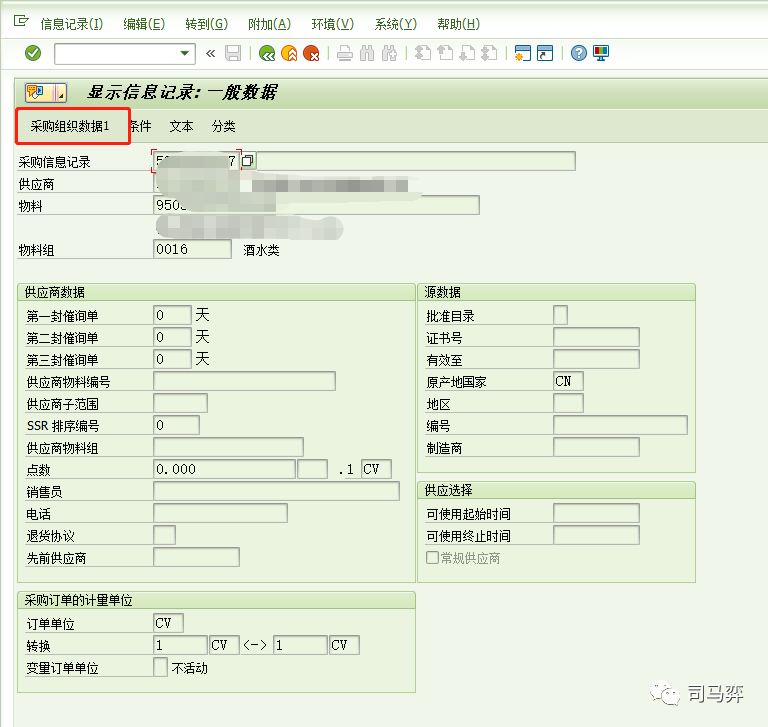 进入界面后,点击【采购组织数据1】,进入价格界面: