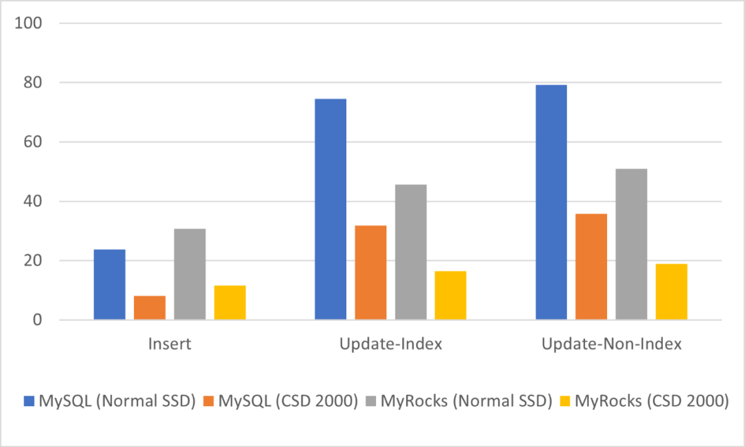 图9. 512B行大小下,MySQL和MyRocks在不同SSD下的归一化数据写入量
