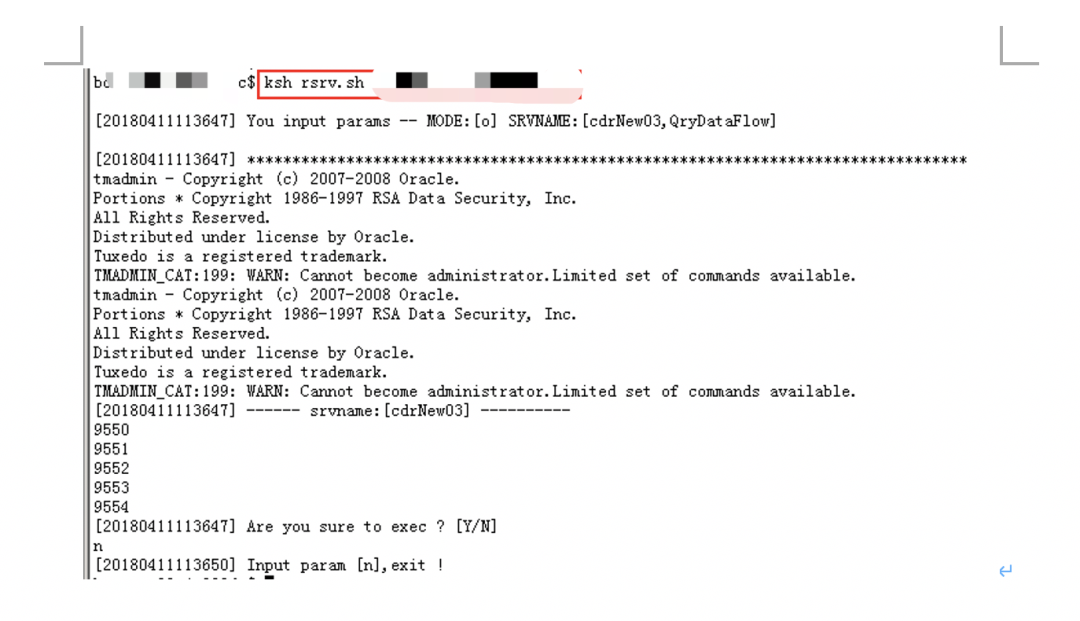 使用该rsrv.sh脚本可在遇到服务调用量突增导致业务积压需要临时扩服务进程,或者服务故障需要重启/逐个进程重启的时候,实现TUXEDO中间件服务快速重启、扩进程的目的。尤其是遇到服务进程需要逐个重启的时候,非常有用,大大提高工作效率和准确度。