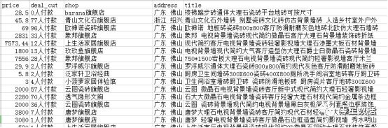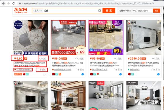 数据来源淘宝网,关键词为瓷砖,共100页,4404条数据。由于考虑到淘宝是通过Ajax加载,参数加密的,并且有诸多的反爬机制(验证码,滑块等等),本文使用的是selenium+xpath获取数据,并且在进行淘宝登陆界面时需手动扫码登陆,当然也可以改写为模拟登陆代码(输入账号密码+动作链即可)。