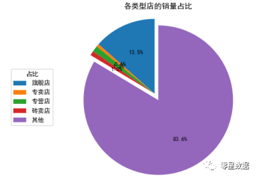 分析1:在淘宝网上,旗舰店数量最多,但是像旗舰店、专营店、专卖店等较为官方的店铺销量并不高,其中旗舰店销量占比为13.5%,专营店、专卖店等销量不超过2%。