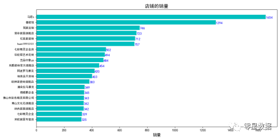 旗舰店占总销量的13.5%,而专卖店、专营店和砖卖店的销量占比也很低。接着统计各个店铺的销量(TOP20),绘制条形图。