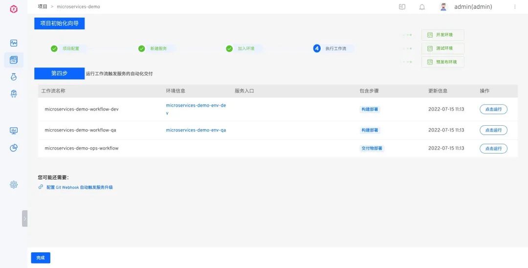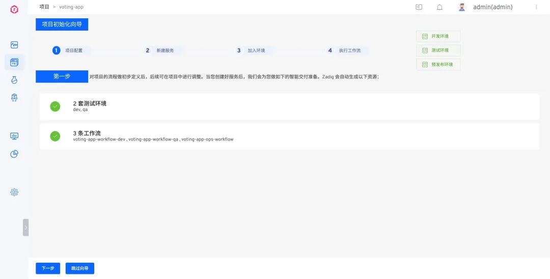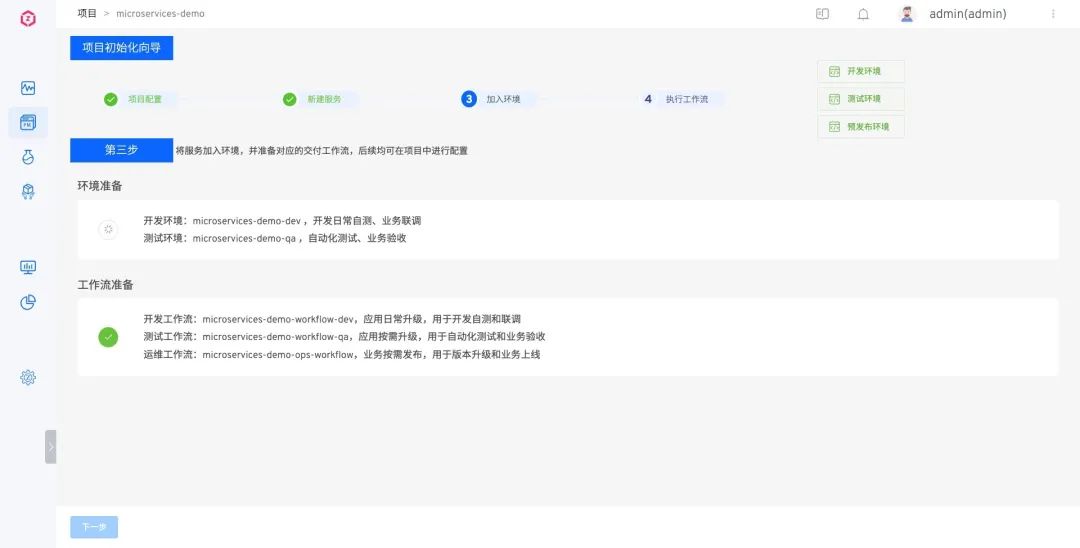服务配置完成后下一步开始加入环境,同样默认情况下会自动创建一套 dev 和 qa 的环境以及 3 条工作流。