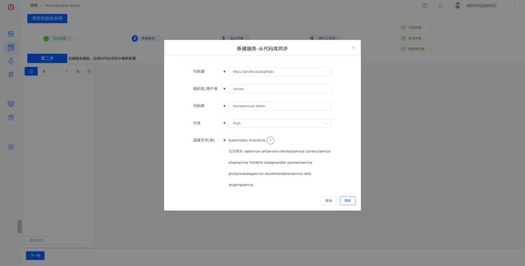 进入到服务配置页面,我们知道服务模板可以通过手动创建、代码仓库中同步或者现有 K8s 资源中导入而来。我们这里服务模板在代码仓库中,所以选择从代码库中进行同步,选择对应的代码仓库、分支和对应的资源清单目录,然后点击同步