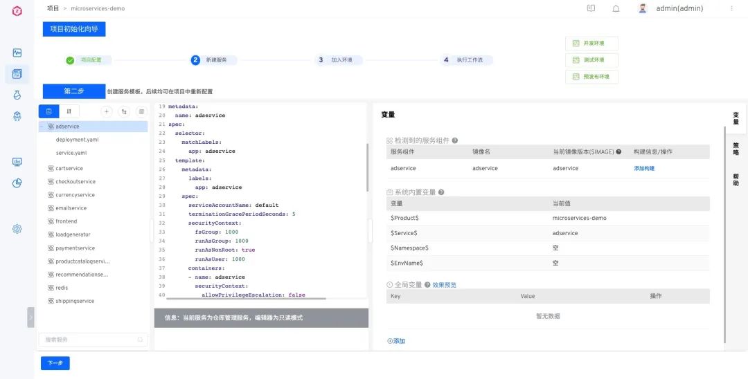 可以看到我们这里同步过来后包含了 12 个服务,每个服务的模板也都直接展示出来了,但是由于是通过仓库同步的,模板是只读模式,右侧会自动读取到服务对应的镜像信息。