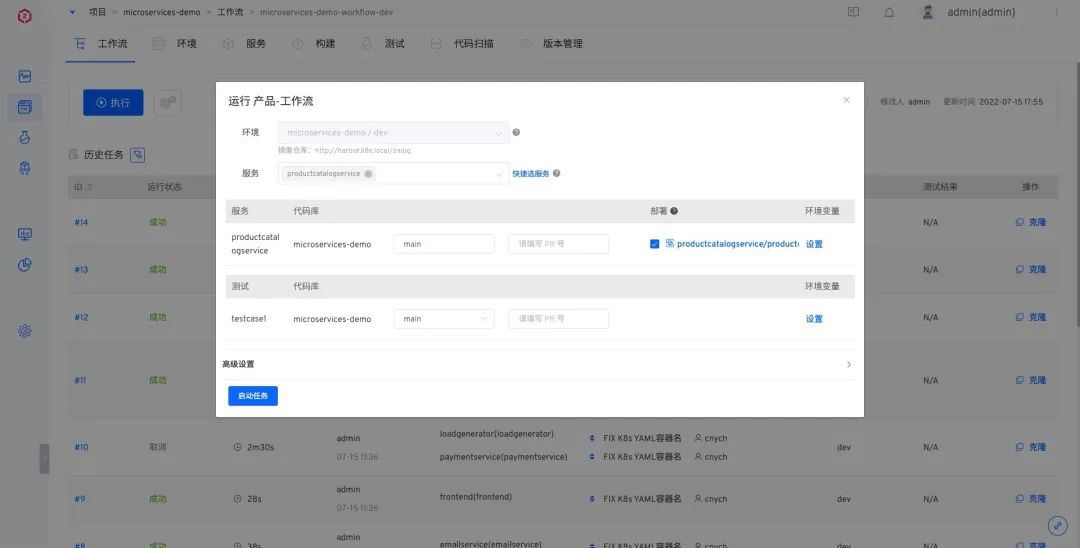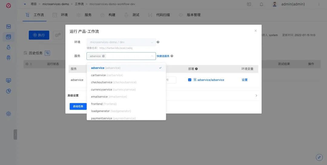 工作流,在服务中可以选择我们要构建的服务,可以选择一个也可以选择多个服务。