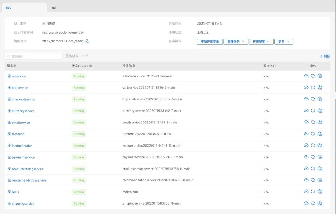 将所有的服务执行完成后在环境页面可以看到所有服务的状态和最新镜像信息。