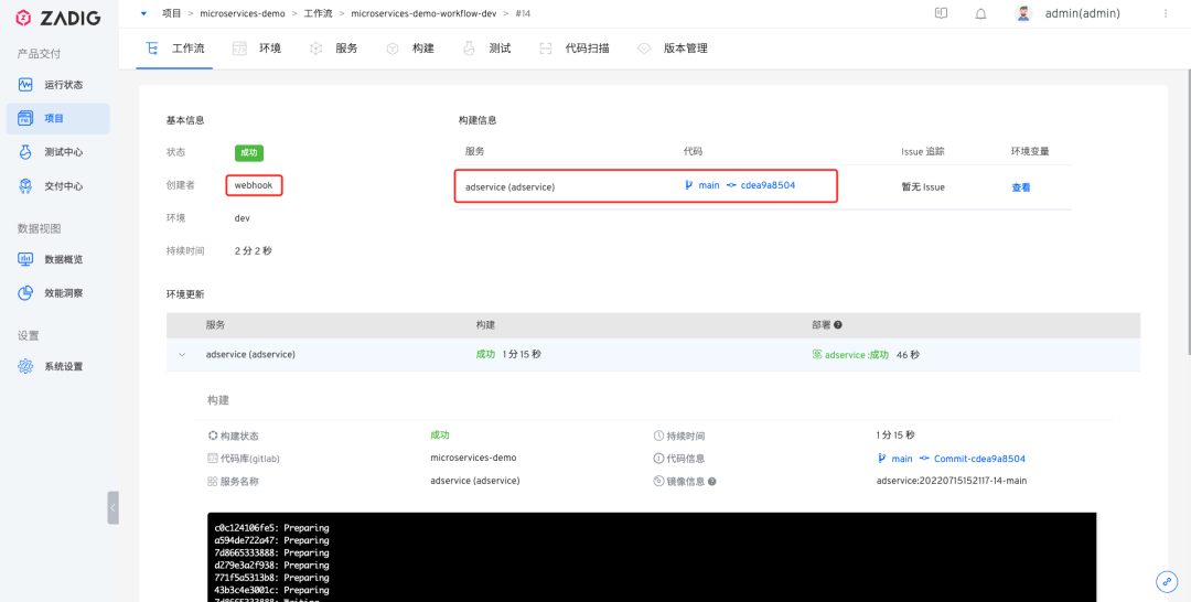 当我们将上述代码 push 到 main 分支后,Zadig 就立即触发了一次新的任务。