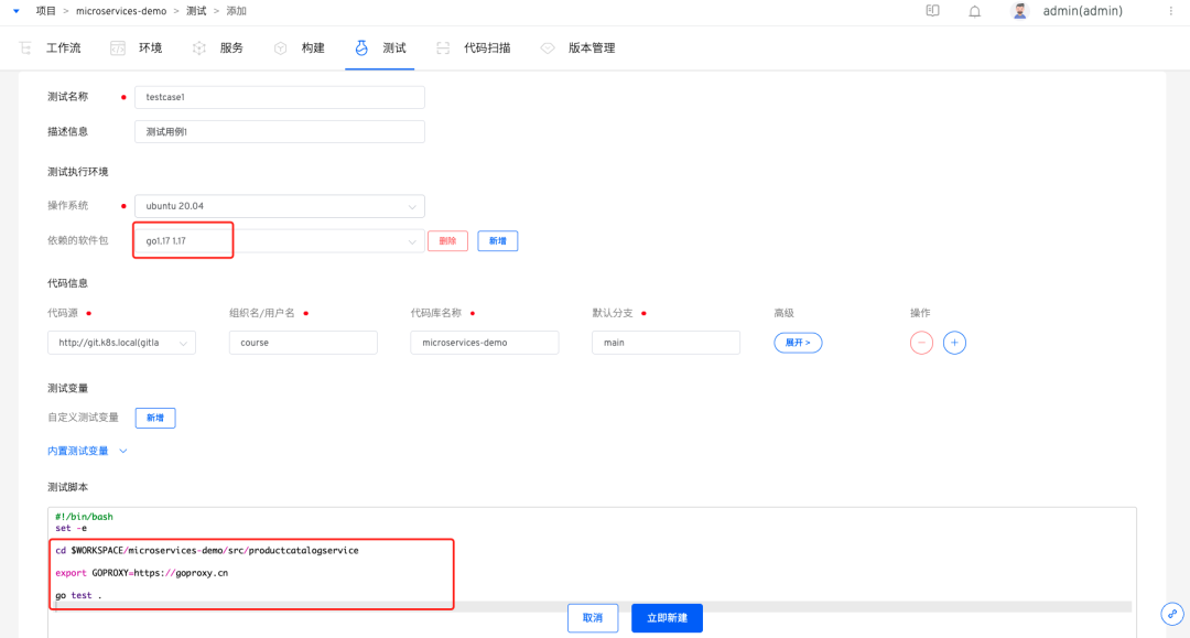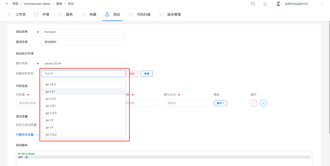 比如我们这里对一个 go 服务做一次简单的测试,在依赖的软件包中可以选择对应的依赖,如果没有对应的软件包,则可以新建一个。