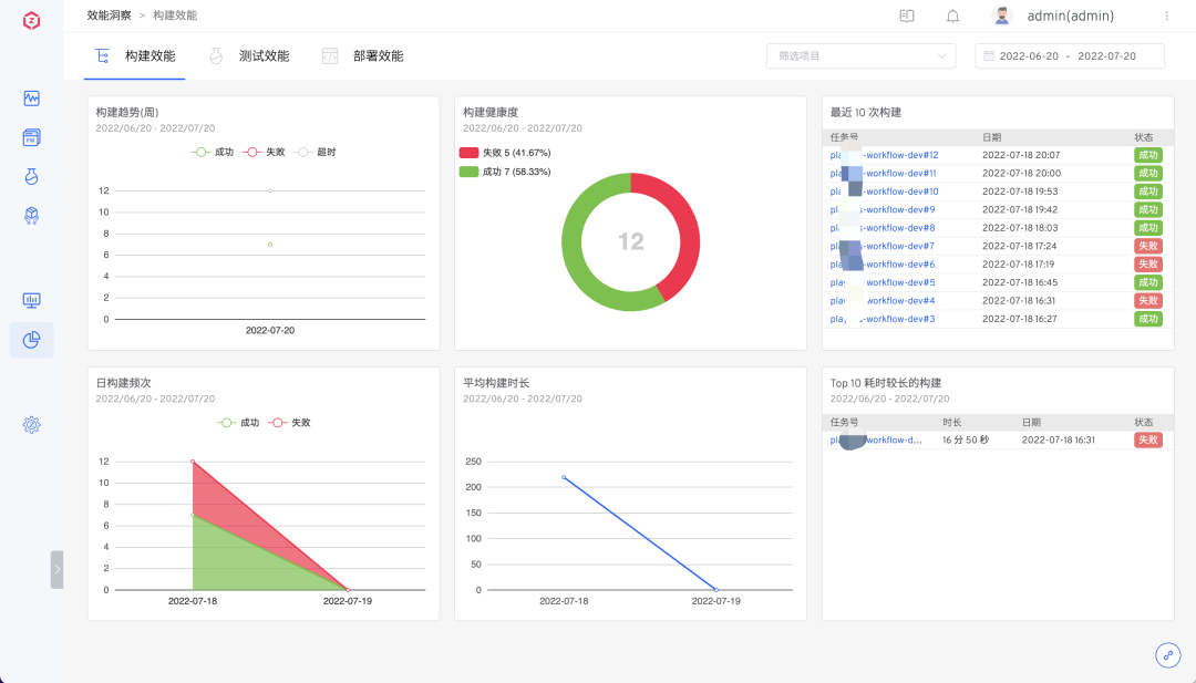Zadig 还会为我们的构建数据进行统计,提供构建效能、部署效能等数据。