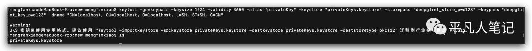 注意:所有口令必须包含字母数字eg: keytool -genkeypair -keysize 1024 -validity 3650 -alias "privateKey" -keystore "privateKeys.keystore" -storepass "deepglint_store_pwd123" -keypass "deepglint_key_pwd123" -dname "CN=localhost, OU=localhost, O=localhost, L=SH, ST=SH, C=CN"