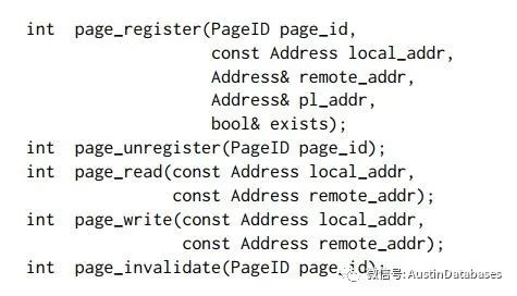 Page Address Table (PAT), PAT 是一个hash 表,这里的slab节点的ID 和物力内存的地址被存储在这里,同时包含每一个页面的计数。在页面注册中,主节点通过查找PAT表来确定页面是否已经存在,如果不粗在,则会在页面被分配到内存池内后在PAT表里面进行注册。当一个页面被从远程内存吃中驱逐后,或者被清理后对应的PAT 中的记录也会被清理掉 。