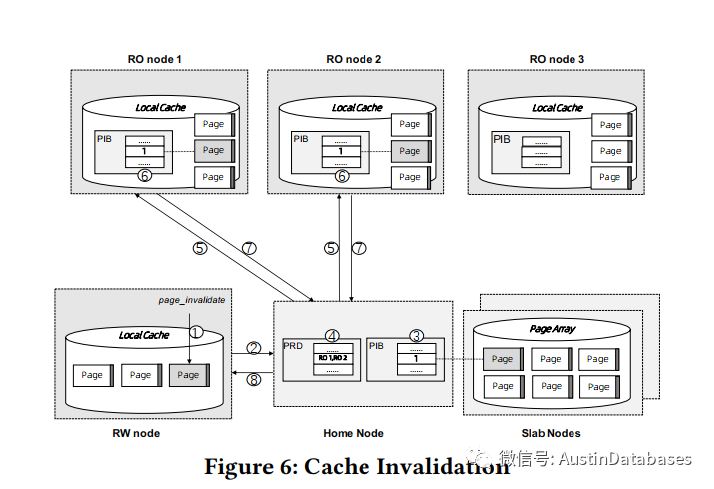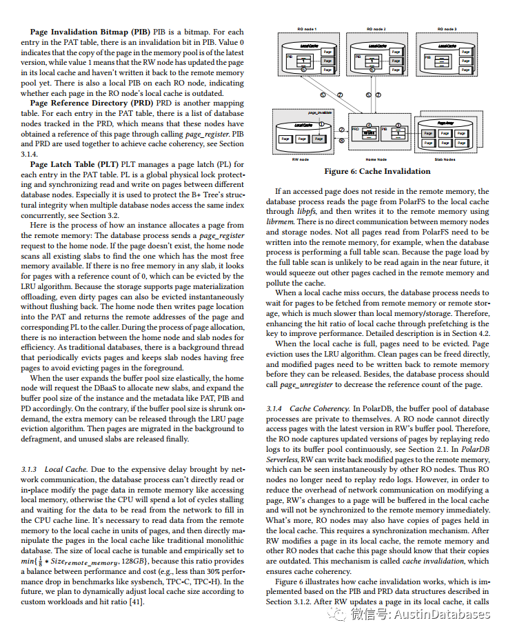 PIB ,无效页面位图,PIB 是一个位图,对于在PAT表中的数据状态我们有一个无效的位图,值为0表示拷贝页面的最后的版本,当值为1时意味这RW节点已经在本地更新了,但还没有更新到远程的内存池。 这里也有一个本地的PIB,针对每一个RO 节点好嗨每一个在RO节点中的本地的缓冲是否过时。