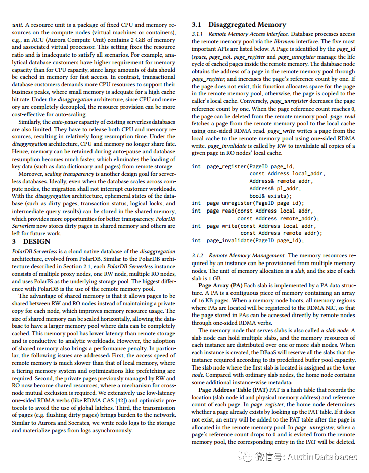 基于POLARDB 共享的内存最大的优势是,数据页面在RO 和 RW 节点是共享的,这改变了每个节点都需要进行内存的维护的问题,提升了内存利用率。这里的内存可以进行水平扩展,数据库有一个很大的内存池保证数据库可以完整的被加载进内存中。内存池的另一个好处是对比远程的数据的存储有更低的延迟。然而采用共享内存带来性能上的问题,远程的内存池的访问要对比本地的内存池访问要慢,这里就需要内存分层和预读技术的,而私有的内存页面变为的 RW RO 共享的内存页面,这就需要有一种互斥的机制。这里我们广泛的采用低延迟的RDMA verbs 和乐观锁避免全局的闩锁。最后一点是页面的传输给如刷写脏页给网络带来了负担,如 Aurora 和 Socrates, 我们写redo log 到存储和物力页面的方式是通过日志的同步的方式。