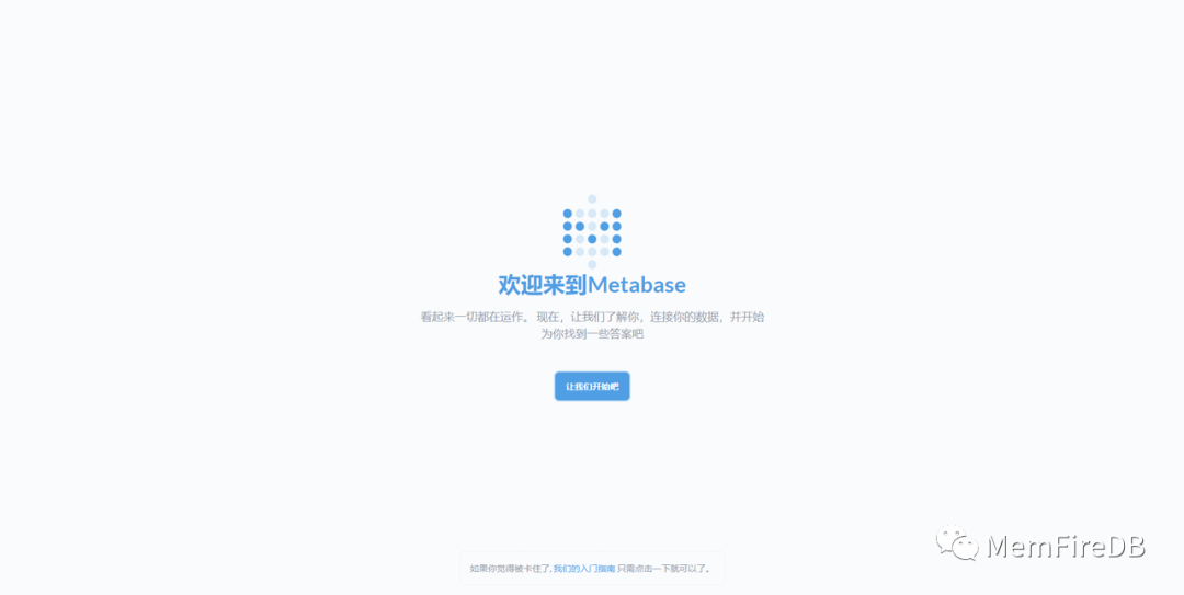 jar文件下载地址 https://www.metabase.com/start/oss/jar Java需要版本8或更高,执行命令启动 java -jar metabase.jar 服务启动地址 localhost:3000 Metabase 启动后,可以看到如下界面