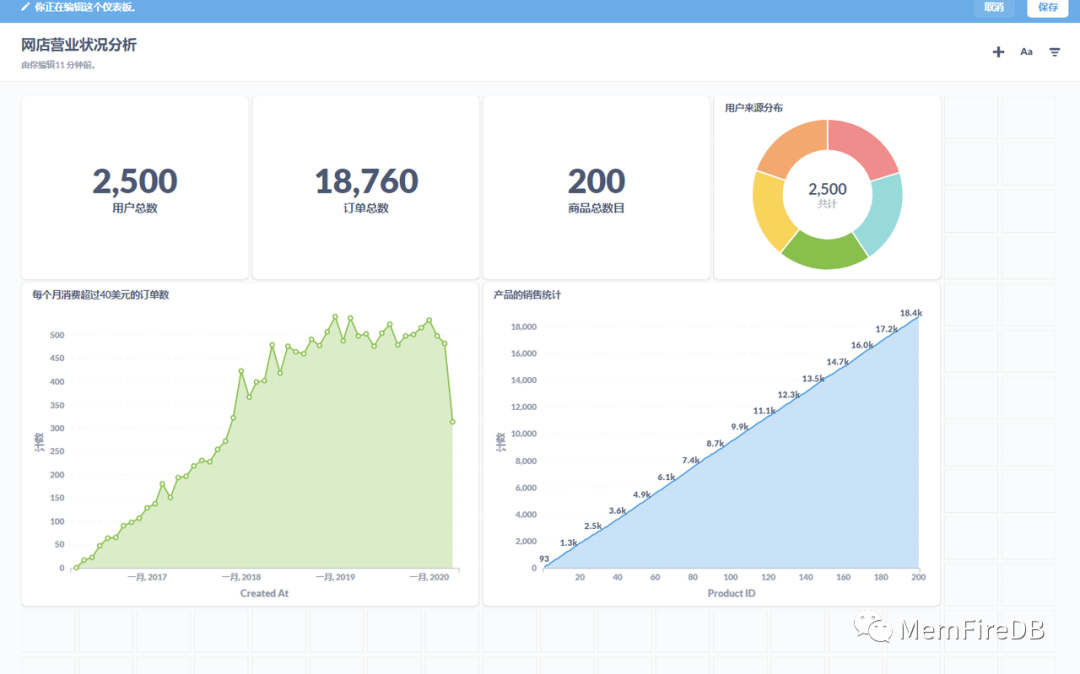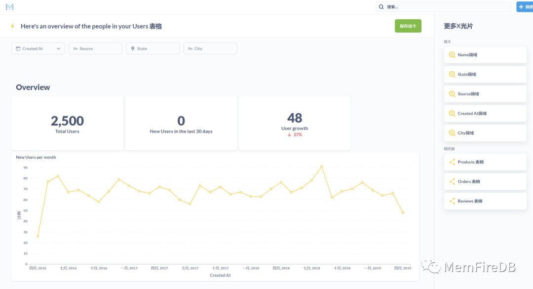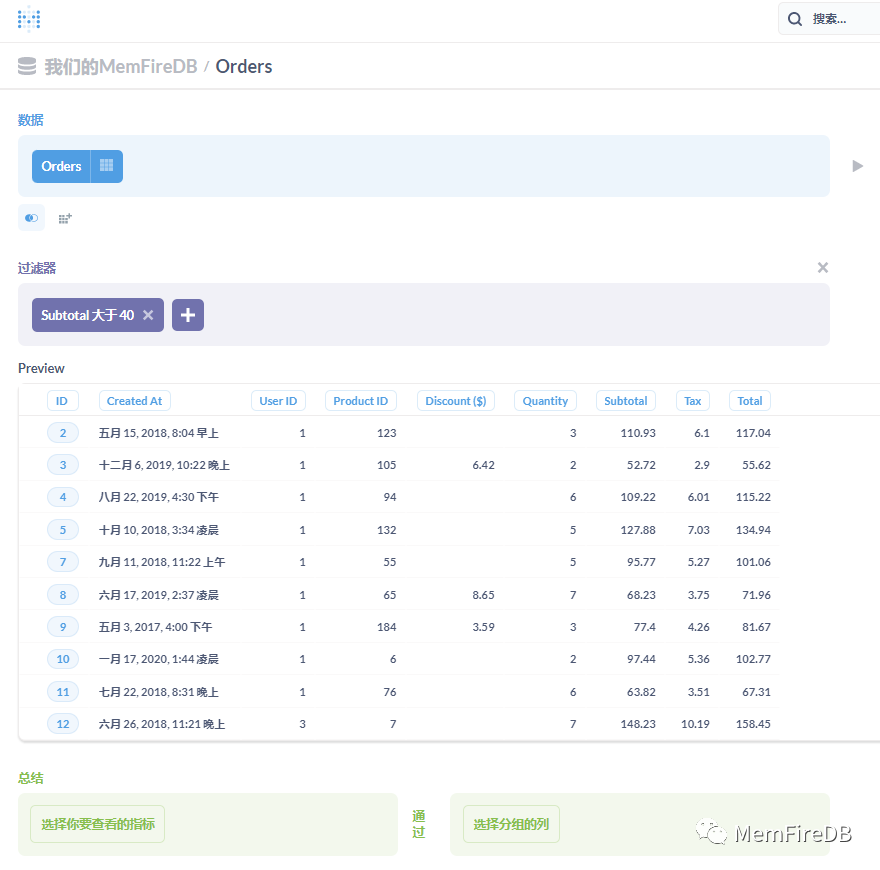 您可以通过过滤和总结其结果来处理问题,将这些探索保存为新问题,并将问题添加到仪表板. 对于接下来的几个示例,我们将使用 Metabase 中的我们的MemFireDB数据库。