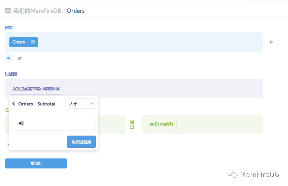 假设我们查询,有多少订单的价格大于40美元?为了找出答案,我们想按我们感兴趣的字段过滤数据,在本例中是Subtotal