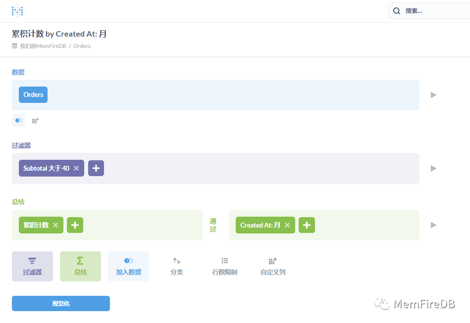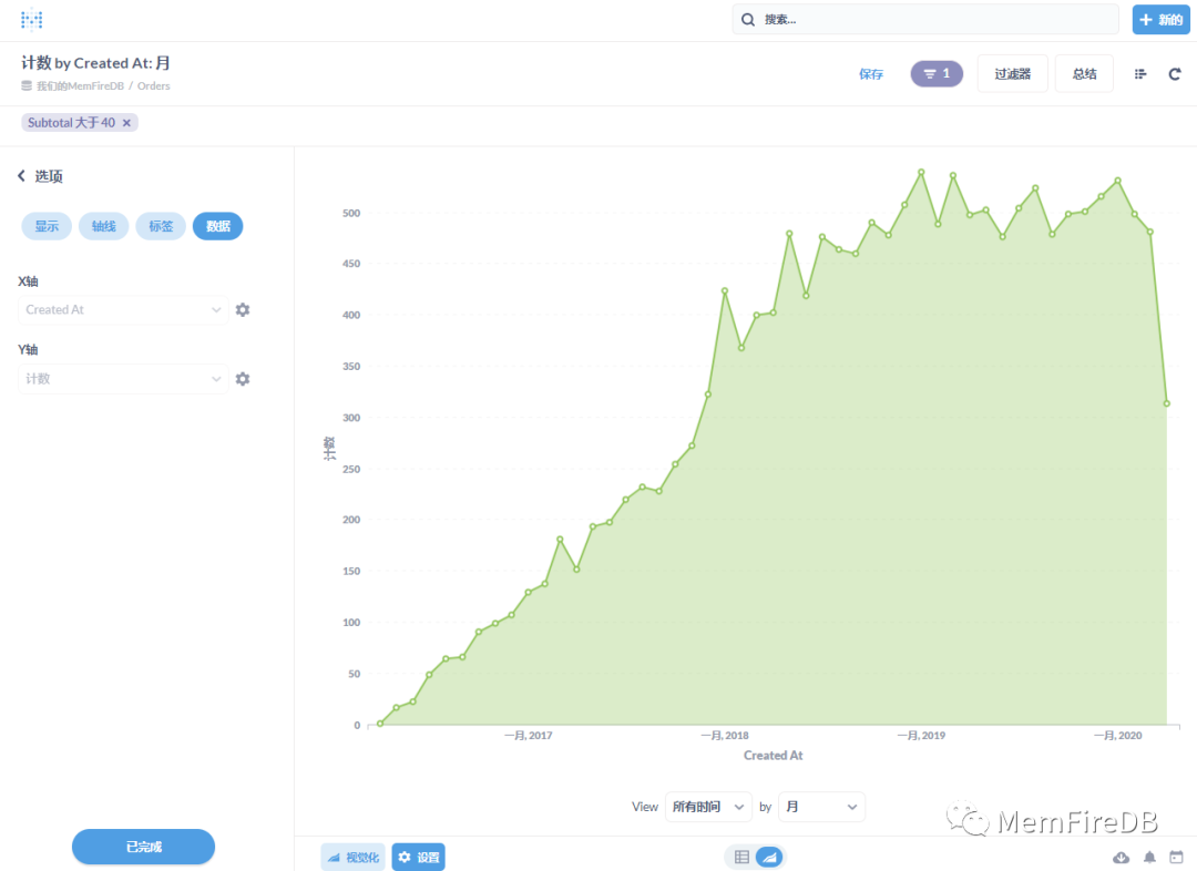接下来我们希望按月进行分组,了解每个月多少个超过40美元的订单?那么可以选择总结,累计计数,单击旁边的按月Created At