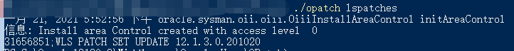 用户可以通过进入 WebLogic 安装主目录下的 OPatch 目录,在此处打开命令行,输入 .\opatch lspatches 命令,结果如下: