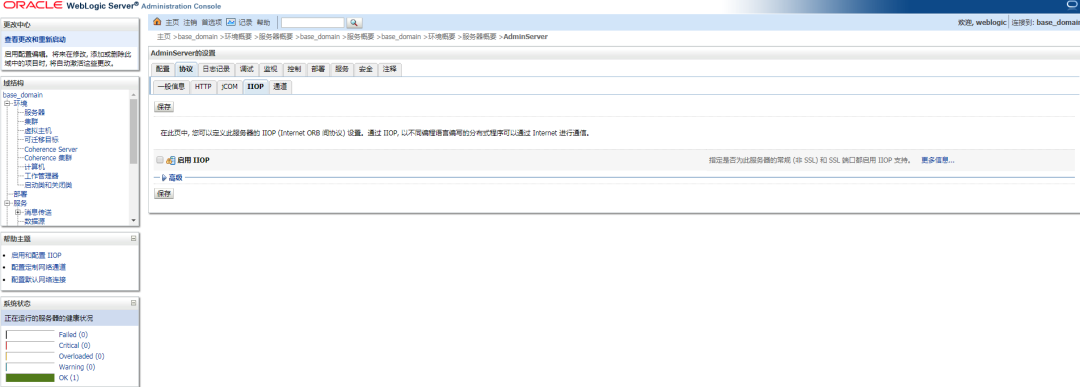 在 WebLogic 控制台中,选择“服务”->”AdminServer”->”协议”,取消“启用 IIOP”的勾选。并重启 WebLogic 项目,使配置生效。