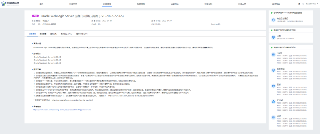 2022年7月20日,深信服安全团队监测到一则 Oracle WebLogic 官方发布安全补丁的通告,共修复了 18 个安全漏洞,其中包含 11 个高危及以上漏洞的信息。