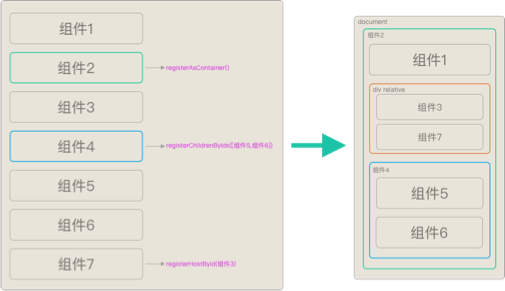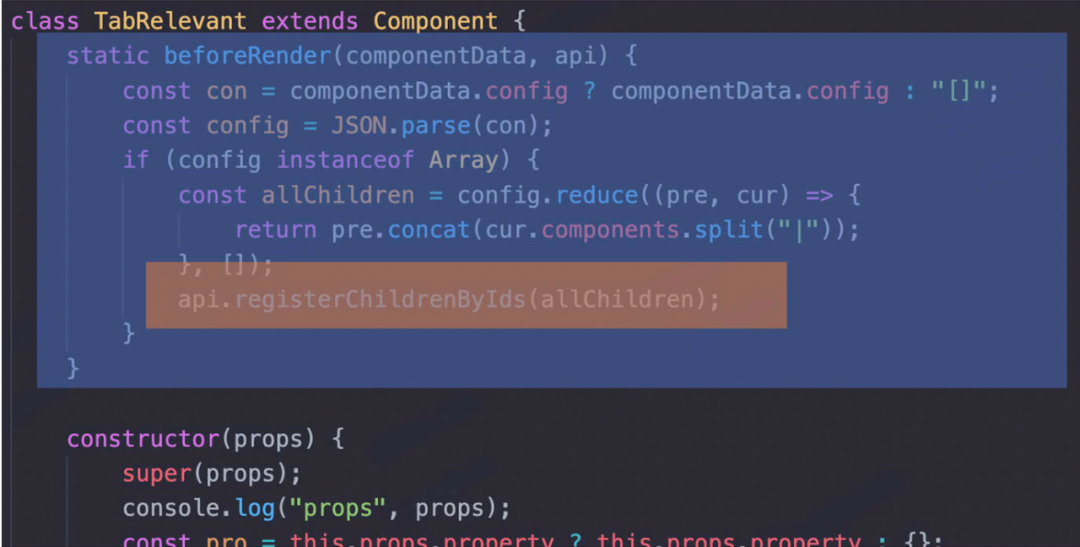 如上图,这是一个tab切换类组件,它的作用是切换其他任意的组件,它需要在beforeRender里面声明好页面上的哪些组件是它的子组件。为了处理这种父子依赖关系的组件,渲染引擎会利用这个函数在渲染之前就把所有父组件和子组件分开,放在两个数组中,并把最终有依赖关系的数据结构传给页面渲染的部分,进行后续渲染。