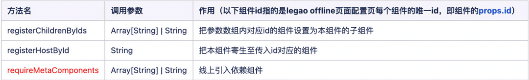 第一个变量componentData,为该组件的配置数据,渲染引擎根据componentData下配置的关联的“子组件id”等数据知道“当前页面”上具体哪些组件是这个组件的子组件或者父组件,第二个变量为一个对象,对象包含几个框架提供的方法,如: