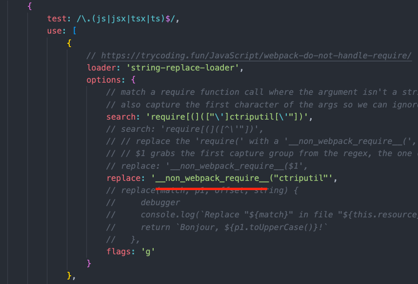 1)因为这个方法的执行环境是node,所以可以“直连”调用node接口和方法。不过这里的require是作用在node环境的,其实并不需要解析,例如require(“ctriputil”),于是可以通过配置rule,利用string-replace-loader自动将require替换为__non_webpack_require__,来防止webpack处理require的资源,例如: