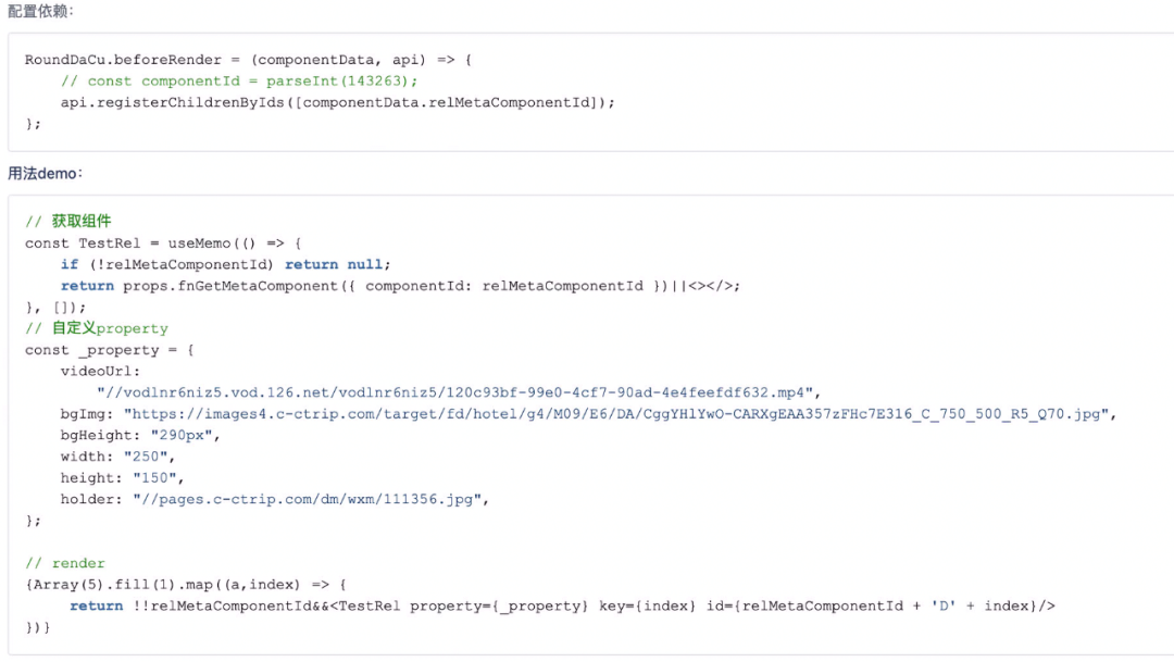 其他组件可以用fnGetMetaComponent通过id依赖该线上组件,这种的使用场景下,被依赖的组件能够读取两部分配置数据,一部分来自运营通过乐高offline配置,一部分是来自开发赋值,如: