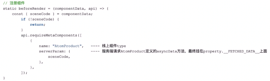 3)需要有组件级别的SSR为了满足这些需求,乐高设计了一些简单有效的机制。会“预处理”一些能够运行在node端(中间层,页面渲染之前)的静态方法,渲染引擎会遍历所有的组件,在拿到组件实例之后,判断哪些组件是否含有这些静态方法,然后通过执行这些静态方法,把影响后续组件渲染的所有数据处理好。2.1 beforeRender静态方法