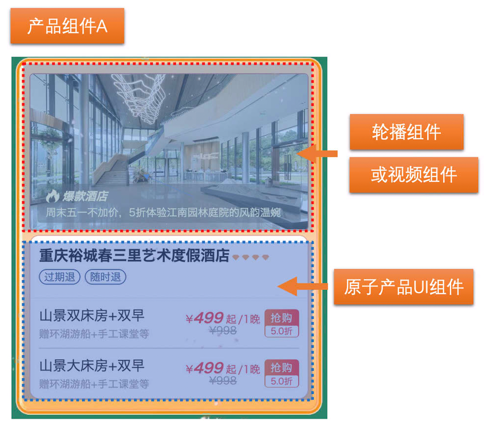 此外还可以提供插槽,如fnRenderProps方法:自定义内容插槽,可在父组件中自定义内部渲染,例如抽取AtomSwiper组件,只负责引入swiper和轮播,至于轮播的内容(组件)则可以通过fnRenderProps定义。渲染引擎在node环境(页面渲染之前)识别“需要依赖的”组件,在线拉取和解析,并处理其服务端请求。在处理这些“原子组件”服务端请求的数据时需要通过renderBy这样的“依赖它的组件id”来区分哪份数据挂载在哪个渲染运行时下,因为原子组件需要考虑一份组件多次复用的情况。fnGetMetaComponents则负责从所有的“在线组件”中查找,并覆盖其渲染属性,并返回最终需要渲染的组件。目前乐高已经有较多这种 “在线组件”的使用场景。例如上文说到的产品组件,通过这种方式拆分为几个组件: