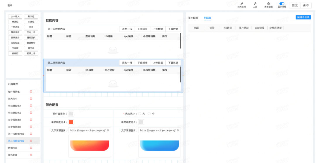 目前这种对接方式已经大量在各种对接三方页面的场景中使用(如任务组件,选货组件,星球号,商城,会员,售卖等等),事实证明,这种轻量、友好的方式能够推动乐高组件的更多使用,也属于乐高“开放性建设”的一个方面。乐高有大量的组件,每个组件都有不同的属性配置面板,如果都去花费人力开发维护,则无疑是一项巨大的工作,不利于组件的扩展,于是我们基于自身需求,开发了“动态表单”。初期是希望能够解决组件的配置问题,但是后来建设中觉得这种表单其实有更广阔的应用场景,可以走出乐高,走向公司,为更多类似的表单场景提供配置能力,这也是乐高“开放性”建设的思考的一个点。动态表单孵化于建设平台过程中,是一种可视化在线配置动态表单方案,专注于解决通用常规表单的可视化自由配置,目前能够解决大部分的常规表单的在线配置场景,支持数据联动、复杂数据嵌套、拖拽布局等。
