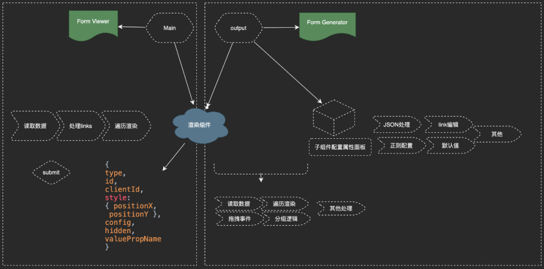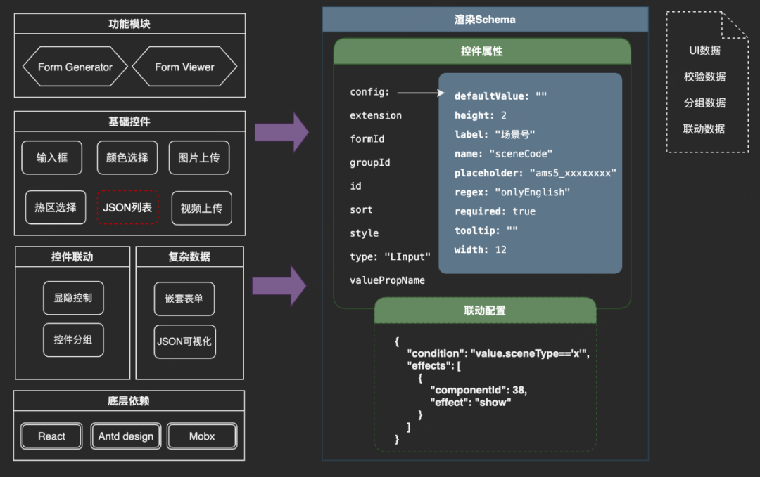 系统有表单生成器编辑面板Form Generator,表单渲染入口Form Viewer两个主要模块。这两个模块共用常规的基础组件如输入框,颜色选择等,还有一些基于业务扩展的复杂组件,例如热区选择,视频上传,数据聚合(JSON列表)等。