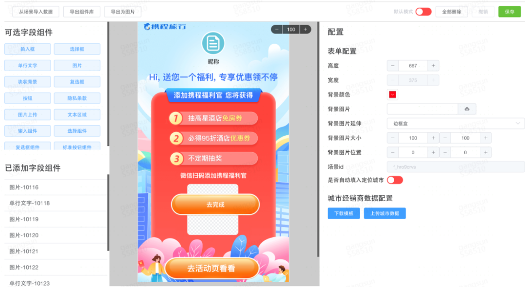 运营同学通过乐高的“DIY组件”,可自主拖拽配置产品UI界面,最后只需要把“产品画布”的场景号配置到上述的“原子产品UI组件”的属性中,即可实现自定义渲染界面,如图: