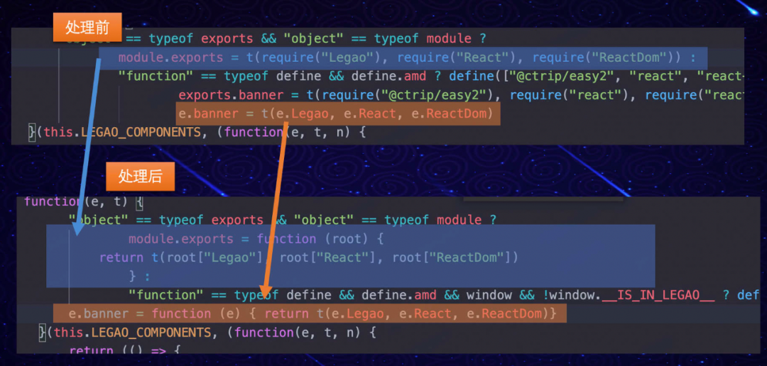 首先需要改造组件的最终形式,使其可以接收公共依赖(react,react-dom,公共依赖等),这时可以修改默认打出的UMD自执行函数,使其返回一个普通函数,“依赖”可以通过渲染引擎在解析时通过“形参”变量传入,如: