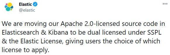 ElasticSearch 数据库及 Kibana 组件,从 Apache 2.0 开源协议,改成 SSPL 和 Elastic License 的双重授权协议(Dual License).