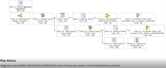 当我们点击屏幕右侧的计划链接时,我们可以在页面底部看到整个查询计划以及相关的费用以及计划建议。计划建议还包括相关影响,以证明遵循建议的好处。