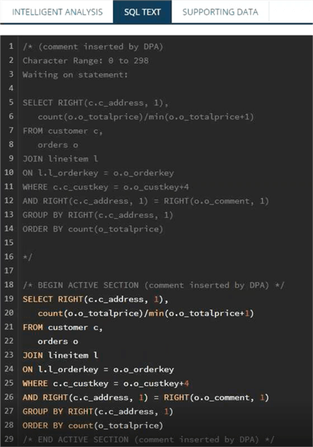 查询性能分析提供了一种方法,可通过着重于等待时间最长的查询,钻取查询中最有问题的部分并获得建议以改进查询(包括代码)来简化查询性能。这会将最重要的信息以一种智能的方式尽快地放在DBA的前面,以解决性能问题,例如: